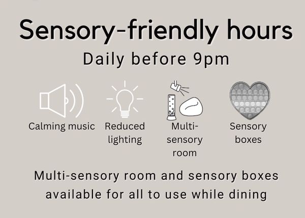 We believe in providing an inclusive environment for our staff, and the same goes for our guests. Our sensory boxes and multi-sensory room allow guests to dine in our restaurant at ease knowing that there are fidgets, weighted blankets, and noise-cancelling headphones they can use, and a sensory room they can relax in if they are feeling overstimulated or anxious.
